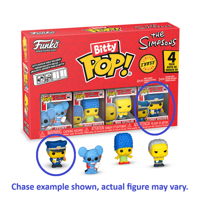 Running out of space for full-sized Funko Pop! vinyl figures? Build a collection that takes up a fraction of the space with Funko Bitty Pop! collectible vinyl figures that are approximately 0.9 inches (2.3 cm) tall. Expand your Simpsons collection with this 4-pack featuring Bitty POP! Itchy, Bitty POP! Marge Simpson, Bitty POP! Moe Szyslak and a mystery chase Bitty POP!. The possible chase figures are Rare (1/3) Chief Wiggum, Rare (1/3) Lard Lad, Hyper Rare (1/6) Fallout Boy and Hyper Rare (1/6) Bartman.