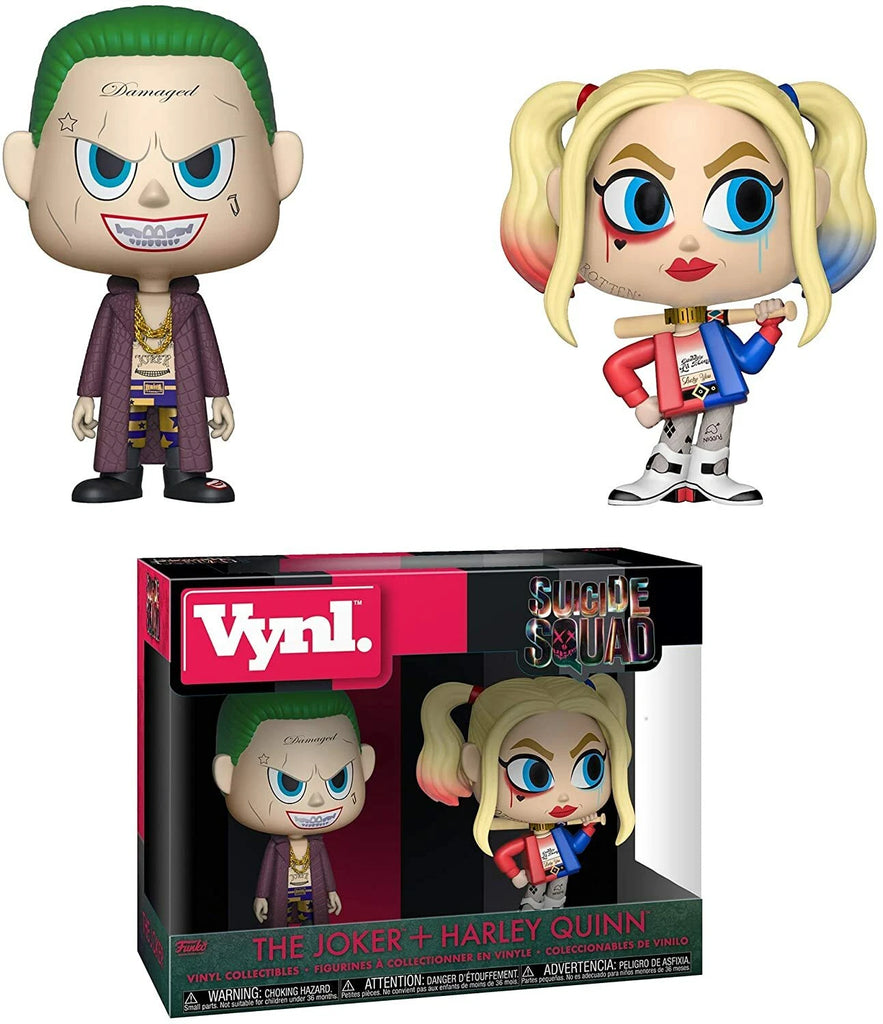 Few Super-Villains can match The Joker and Harley Quinn for style and ability to intimidate. Bring home two of the Suicide Squad’s most infamous members as a Vynl.-stylized 2-pack from Funko! The Joker’s green hair and menacing expression are a contrast to Harley Quinn’s nonchalant pose. Figures stand approximately 3.75 inches tall and come in a window display box.
