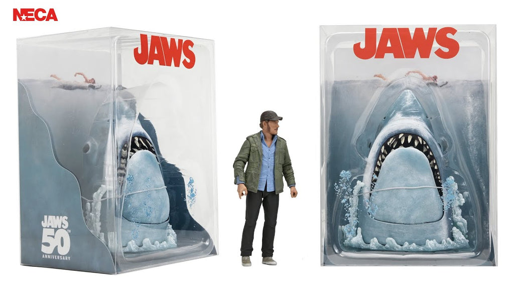 Celebrate 50 years of Jaws! Considered one of the greatest achievements in film, the classic 1975 Steven Spielberg thriller paved the way for what would become the summer blockbuster. In honor of its anniversary, NECA is bringing the movie’s legendary poster artwork to life as a collectible display piece. Sculpted and painted to replicate the intricate detail of the mako shark from Roger Kastel’s original iconic painting, this menacing figure features an articulated jaw and sits atop a stylized water base with sculpted bubbles. Designed to look like a three-dimensional version of the poster, the shark comes in a clear window box with a backdrop insert that recreates the classic poster. It's a must-have tribute piece for Jaws fans!