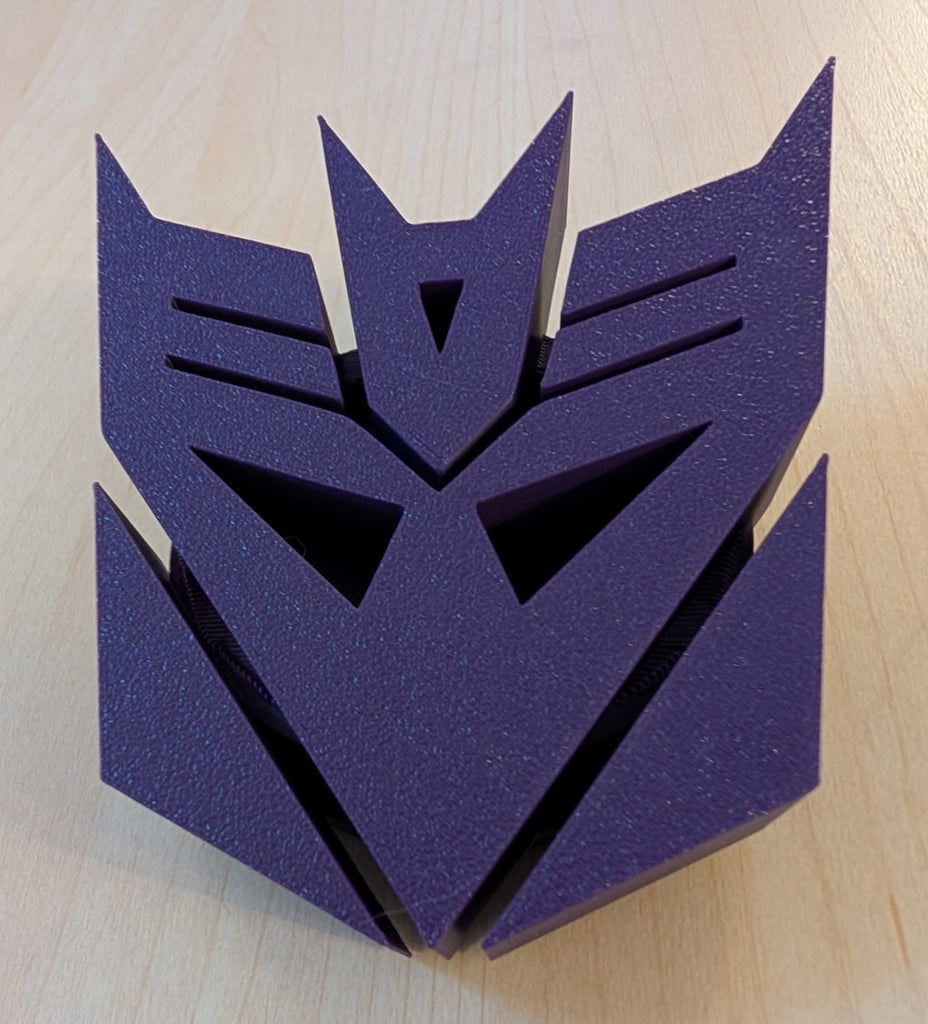 This novelty, pop art, desktop paper weight -- displaying an attractive and eye-catching Transformers, Decepticon faction embossed logo in purple with a black base -- pays homage to the expansive Transformers franchise beloved by kids and adults alike.