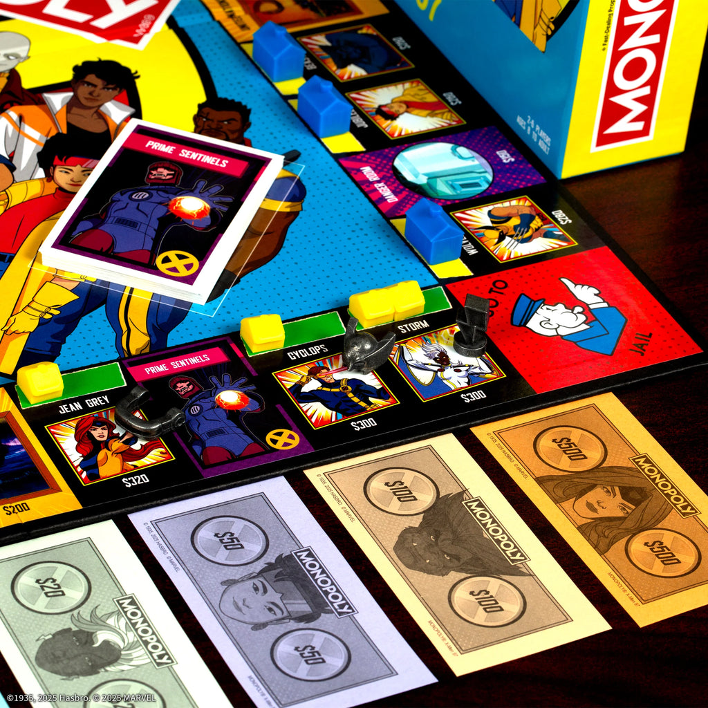 Buy, sell and trade to build your ultimate mutant team with Cable, Wolverine, Jean Gray, Magneto and Morph! Features 6 custom-sculpted tokens: Cyclops-Visor, Gambit-Cards, Magneto-Helmet, Storm-Thunderbolt, Wolverine-Cowl and Rogue-Gloves. Chance and Community Chest (Renamed Human and Prime Sentinels) cards unleash unexpected twists, from gaining new powers to facing off against classic villains.