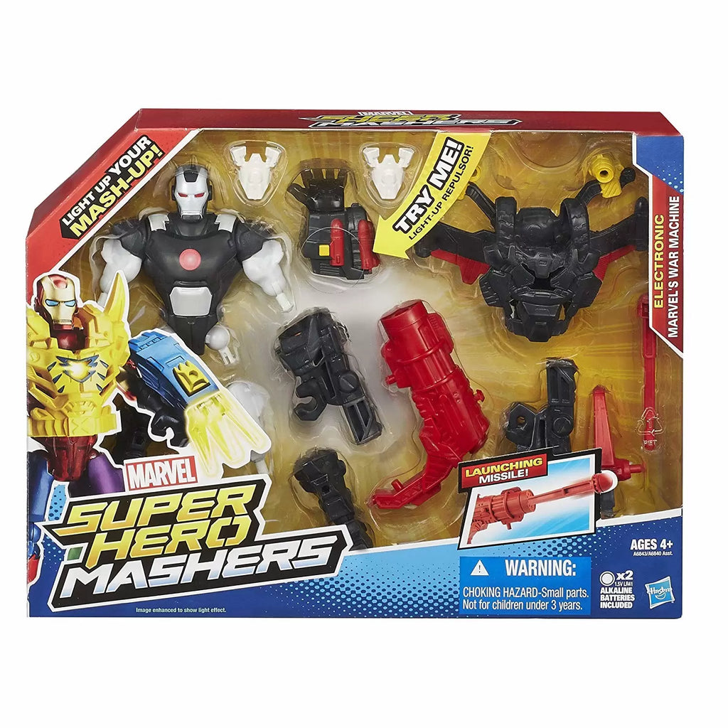 Light up your mash-ups with this amazing Marvel Super Hero Mashers Electronic Marvel’s War Machine figure! He looks just like the armored superhero, with a repulsor that lights up and a launching missile for super-powered strikes, but you can give your hero even more awesome weaponry for the battle against evil. His gear works with other Marvel Mashers figures (sold separately), and their gear works with him too, so you can give him Wolverine’s claws, or Hulk’s leg and make him the ultimate Avenger! Customize your superhero adventures.