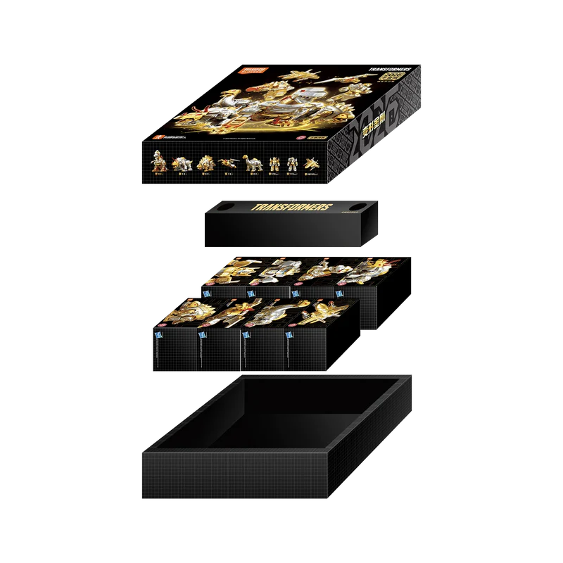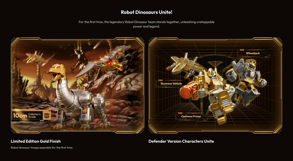 Unveil a new chapter of Transformers 2026: Dinobot Desertion. For the first time, the Robot Dinosaur team assembles, presented with a radiant gold finish and collector-grade craftsmanship. This limited release features popular Defender Version characters including Optimus Prime, Wheeljack, and Skywarp Vehicle.