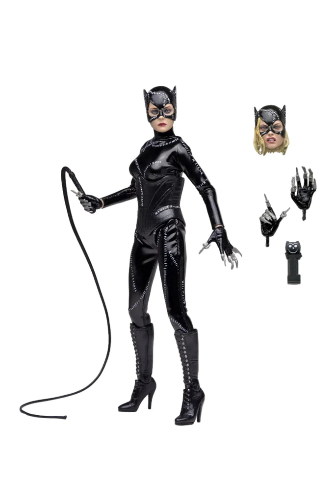 NECA presents this clothed action figure of Catwoman from Batman Returns, featuring the authorized likeness of Michelle Pfeiffer, whose unforgettable performance in the 1992 Tim Burton film still defines the character. Selina Kyle, the repressed and belittled secretary of corrupt industrialist Max Shreck, leads an uneventful, ordinary life. That is, until he tries to kill her after she discovers his sinister secret to siphon off power from the Gotham electrical grid, giving Shreck full control of energy for Gotham City. After surviving the fall and being awakened by alley cats, she unleashes her true, fierce nature and is re-birthed as Catwoman. She allies herself with The Penguin to exact revenge against Shreck and the Batman, who is trying to foil their criminal master plans.