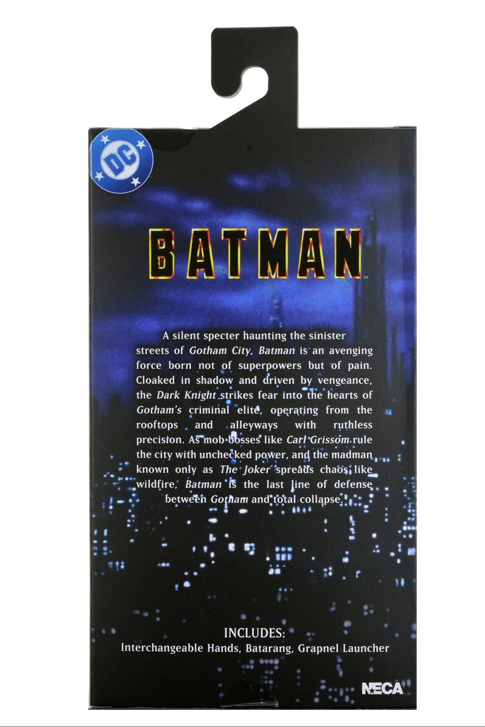 From the iconic 1989 Tim Burton film that defined Batman for a modern generation, NECA presents this clothed Batman action figure featuring the likeness of Michael Keaton. Cloaked in shadow and driven by vengeance, Batman strikes fear into the hearts of Gotham City’s criminal elite. Once terrified by bats, and psychologically damaged from the murder of his parents, wealthy Bruce Wayne channels that fear into his alter ego Batman, donning the cape and cowl to protect the streets of Gotham from low-life criminals and eccentric villains alike. Mob bosses like Carl Grissom rule the city with unchecked power, and the madman known only as The Joker spreads chaos like wildfire, so Batman is the last line of defense between Gotham and total collapse.