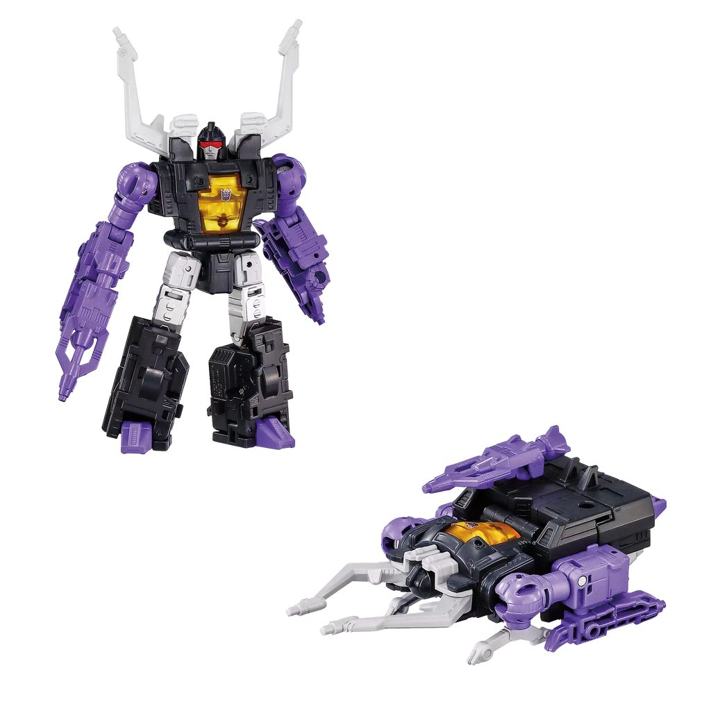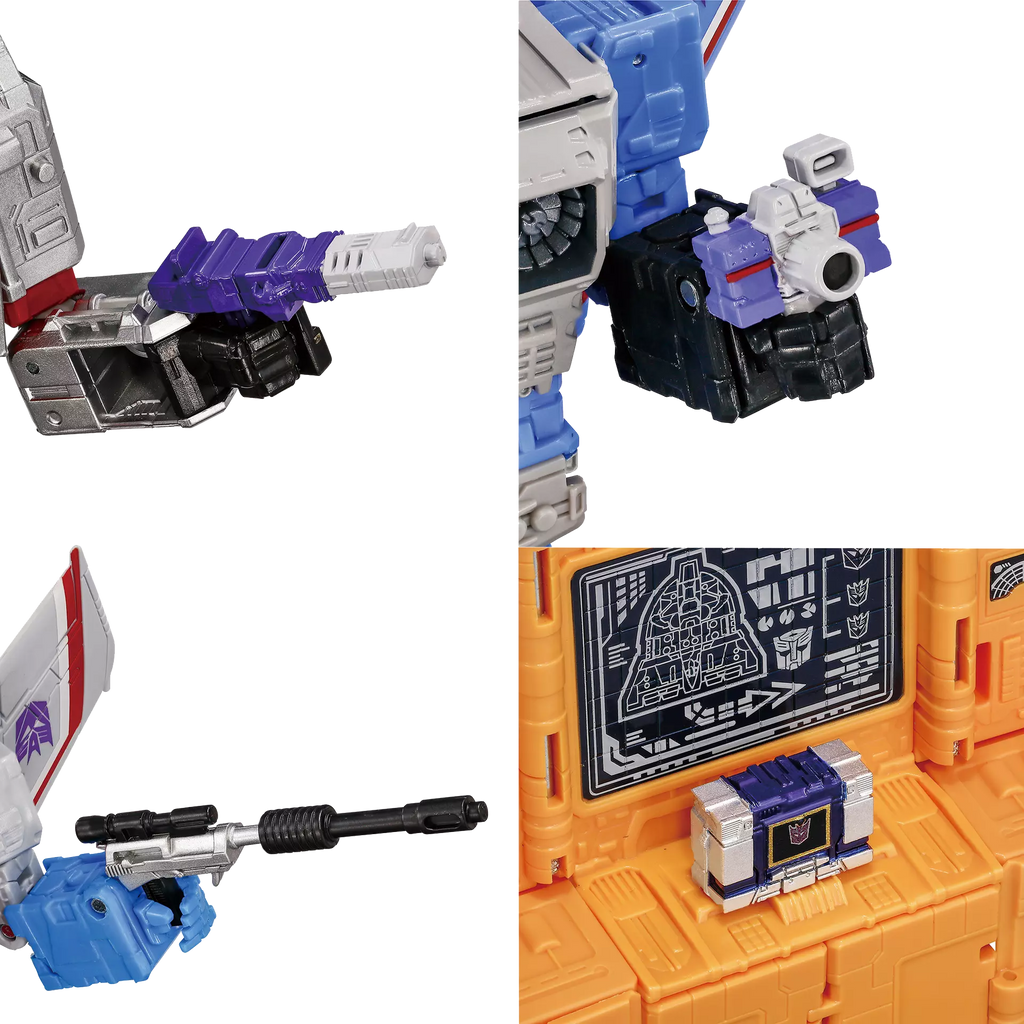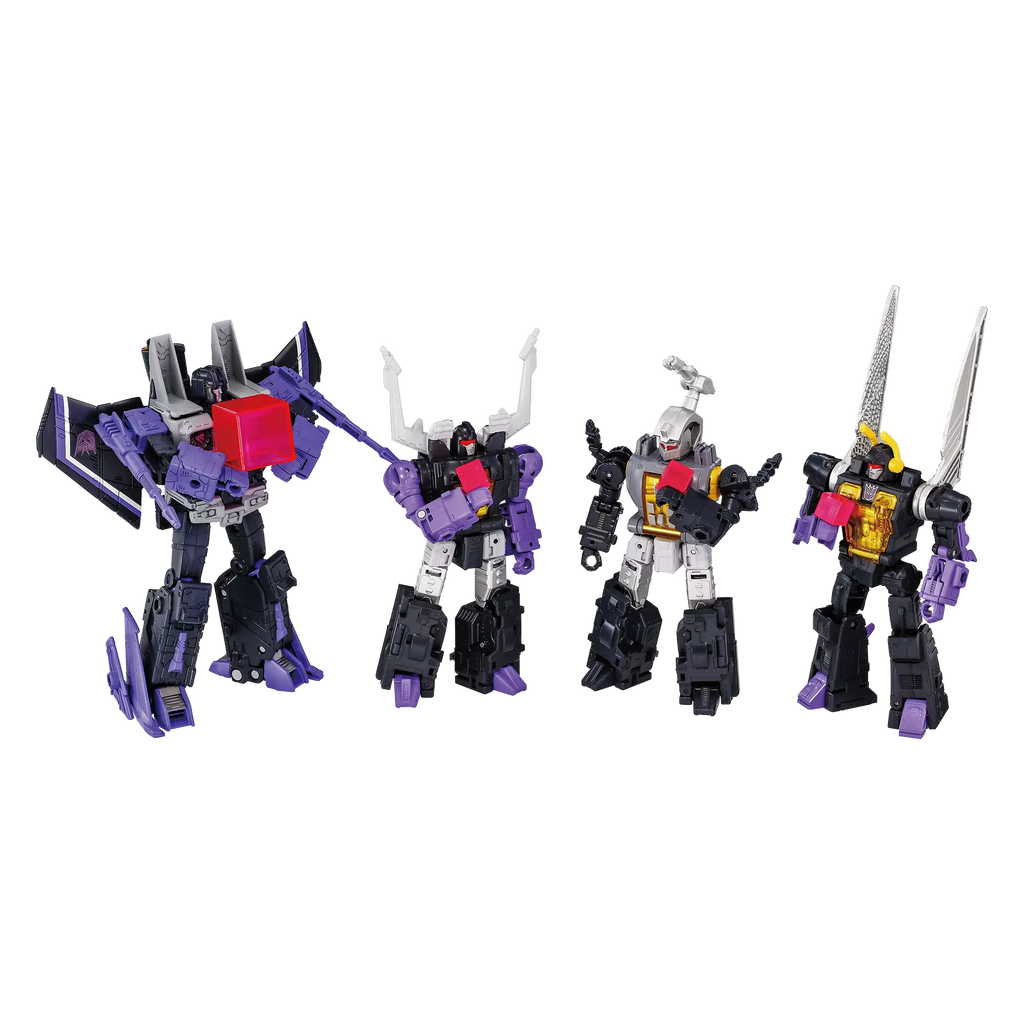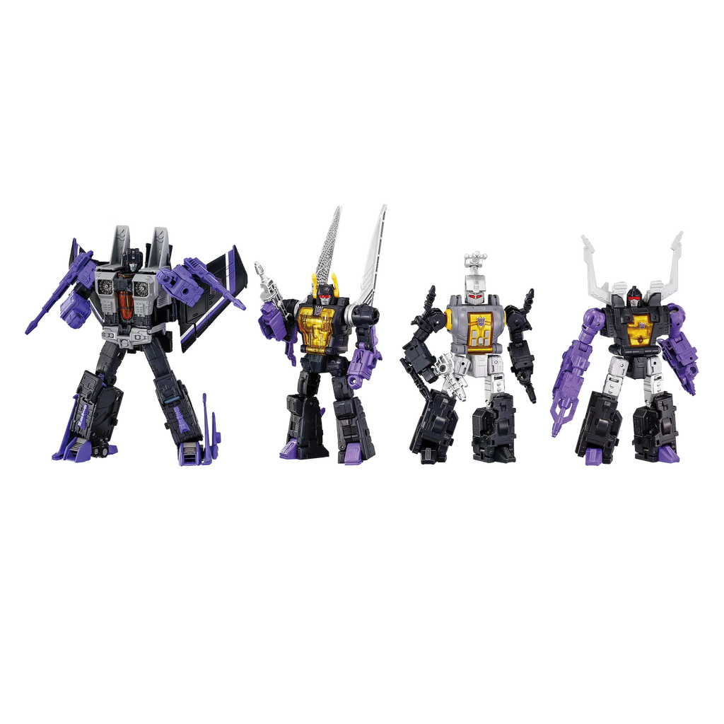 Delicious energon cubes, cubes! This set of four Decepticons is a must-add to any collection of cartoon favorites. The sixth installment of the popular Dramatic Capture Series is Decepticons Part 2, a second set of the Decepticons’ loyal soldiers, Skywarp and the Insecticons. Skywarp is an airman who belongs to the Decepticons’ air force, the Seekers, and transforms into a jet plane. The Insecticons Bombshell, Kickback, and Shrapnel scout out delicious Energon cubes. Set includes four converting Decepticons plus accessory versions of Megatron (pistol), Reflector (camera), laser gun (Shockwave).