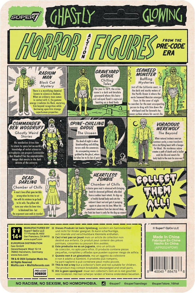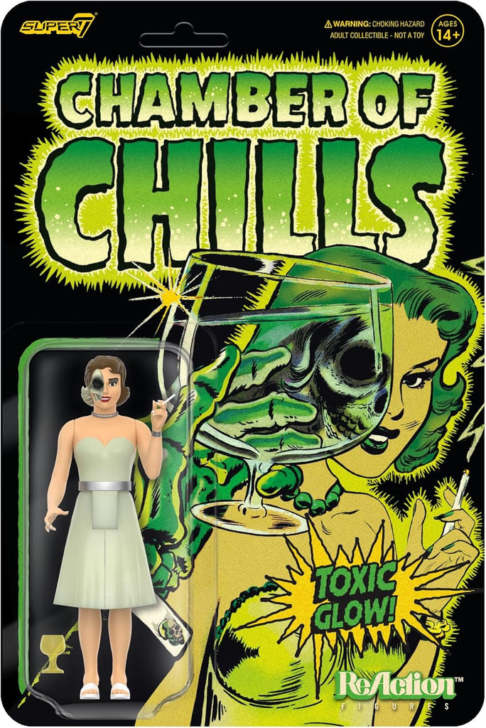 The latest articulated, 3.75-inch scale Pre-Code ReAction Figure of Toxic Glow Dead Darling is inspired by the 1953 comic cover art from Chamber of Chills #19, featuring a blonde bombshell with glow-in-the-dark sculpt detail and a poisoned chalice accessory; the art most famously appears on the cover of the iconic Misfits record "Die Die My Darling\" and the figure is done under license in cooperation with the Misfits. The tale this comic was derived from may have been too intense for the general public, but for fans of the genre, this Toxic Glow Dead Darling Pre-Code ReAction Figure will be just the right addition to their collection!